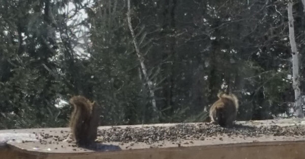 And then, Sunday afternoon before I even got to treat Reddy to his snowmobile ride across the lake and through the trees to his new home in the forest, I looked out to view the chickadees feeding and... there were two more squirrels, proud as pumpkins in October, perched on the bird feeder, filling their cute, chubby little cheeks full of black oil sunflower seeds... getting ready, no doubt, for a night of celebration in the dance hall beneath the floor of the hideaway.