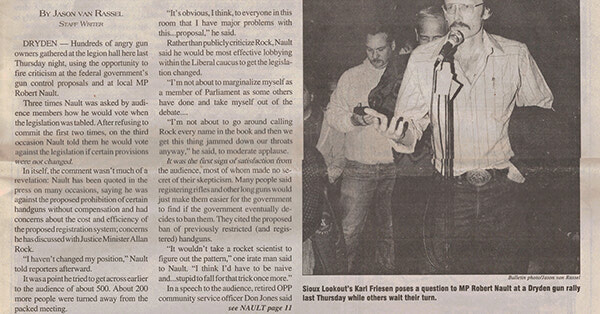 Dryden – Hundreds of angry gun owners gathered at the legion hall here last Thursday night, using the opportunity to fire criticism at the federal government’s gun control proposals and at local MP Robert Nault.