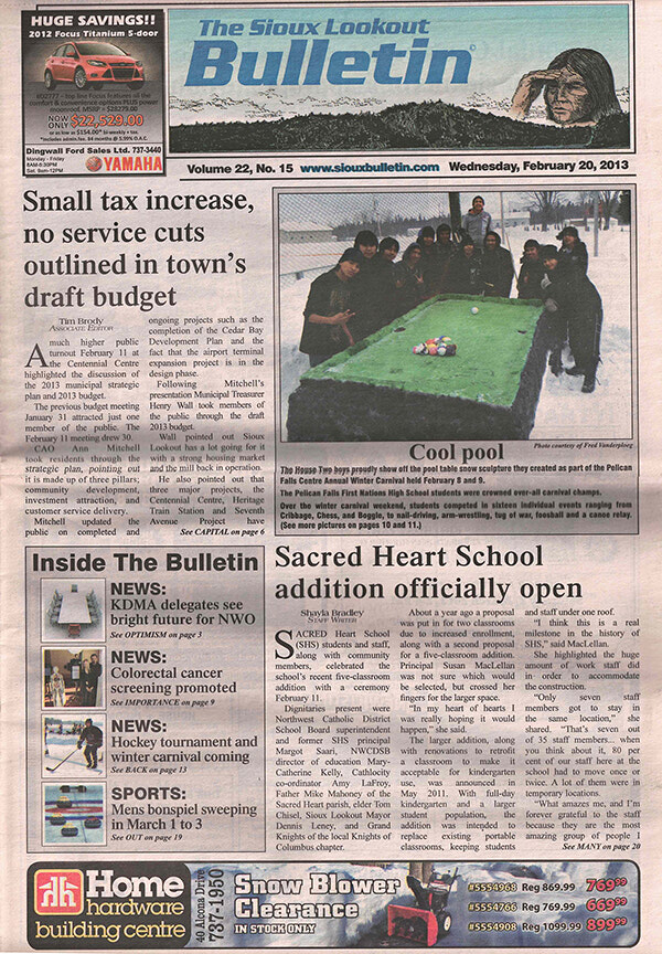 The House Two boys proudly show off the pool table snow sculpture they created as part of the Pelican Falls Centre Annual Winter Carnival held February 8 and 9. The Pelican Falls First Nations High School students were crowned over-all carnival champs. Over the winter carnival weekend, students competed in sixteen individual events, ranging from Cribbage, Chess, and Boggle, to nail-driving, arm-wrestling, tug of war foosball and a canoe relay.