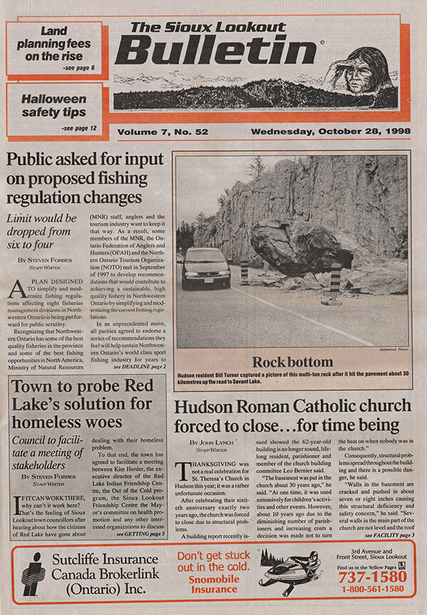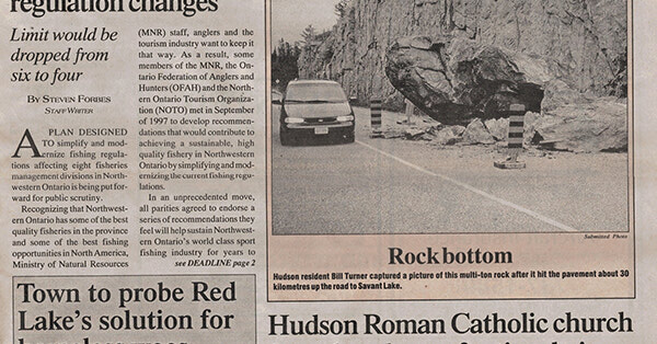 Hudson resident Bill Turner captured a picture of this multi-ton rock after it hit the pavement about 30 kilometres up the road to Savant Lake.