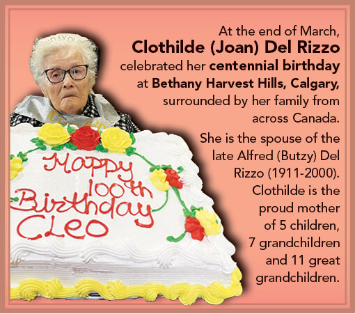 At the end of March, Clothilde (Joan) Del Rizzo celebrated her centennial birthday at Bethany Harvest Hills, Calgary, surrounded by her family from across Canada...